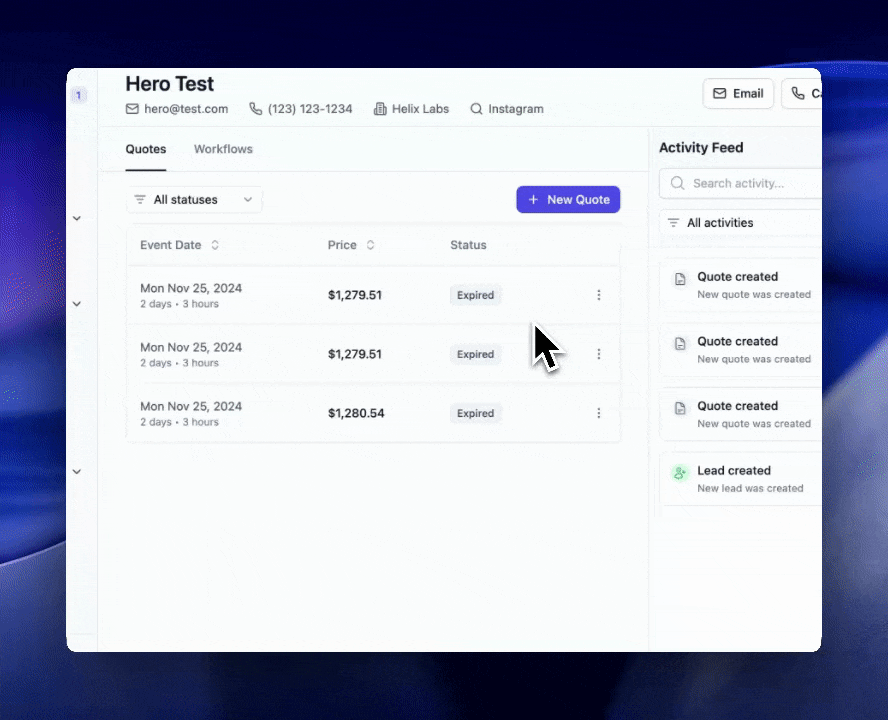 - Full Visibility: Track active workflows, scheduled emails, and lead engagement from both quote and lead views